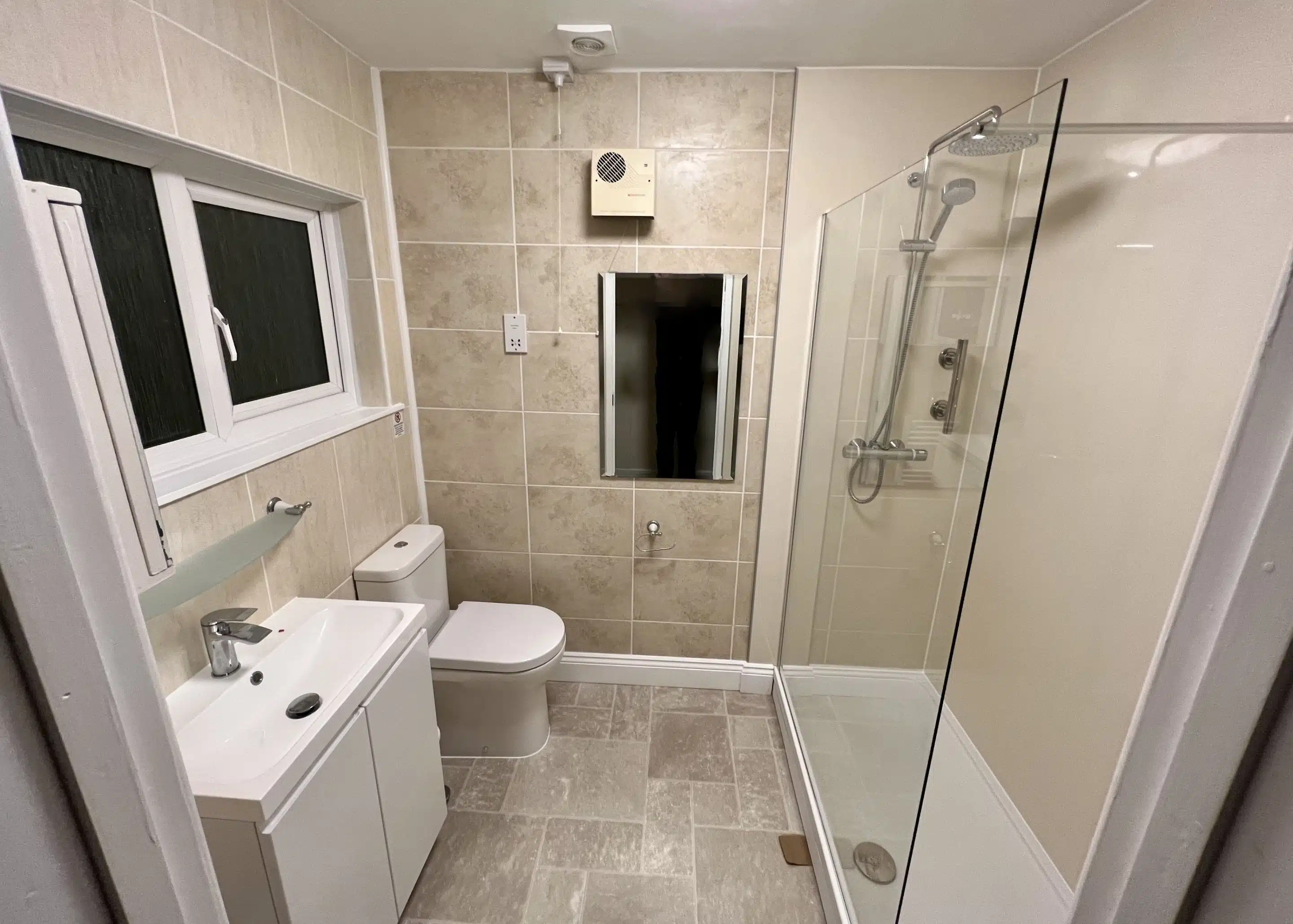 Bathroom: A modern space with a walk-in shower, tiled for a clean and contemporary feel.