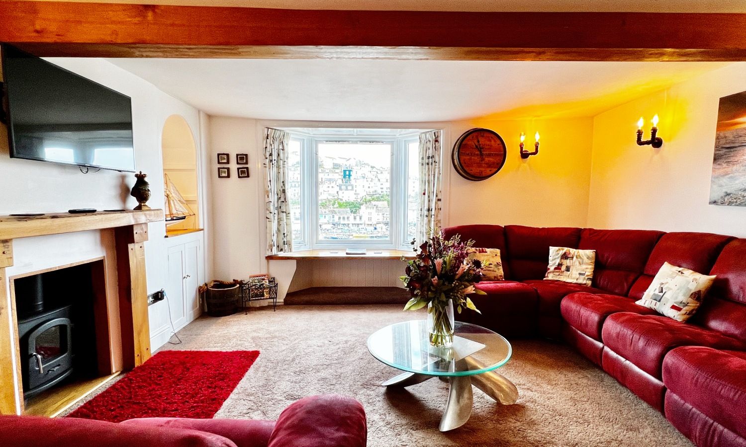 Located on King Street, Fisherman’s Wharf is a lovingly refurbished Georgian fisherman’s cottage, offering a unique blend of historic character and modern comfort. Overlooking the vibrant harbour, this Brixham holiday home provides an idyllic setting to watch the port’s bustling activity. Thoughtful details like wood beams, rich burgundy furnishings, and nautical-inspired art enhance the property’s authentic charm.