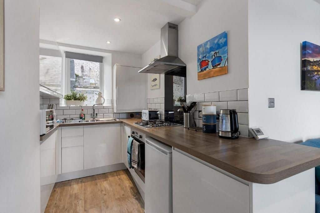 Various windows provide light throughout and plentiful opportunities to enjoy this prime viewpoint from the rooms or the open plan kitchen and lounge diner. Seaside decoration including photography from notable local independent photographer Chris Slack features prominently. The kitchen has classical dark wood countertops and essential amenities including a dishwasher and washer/dryer.