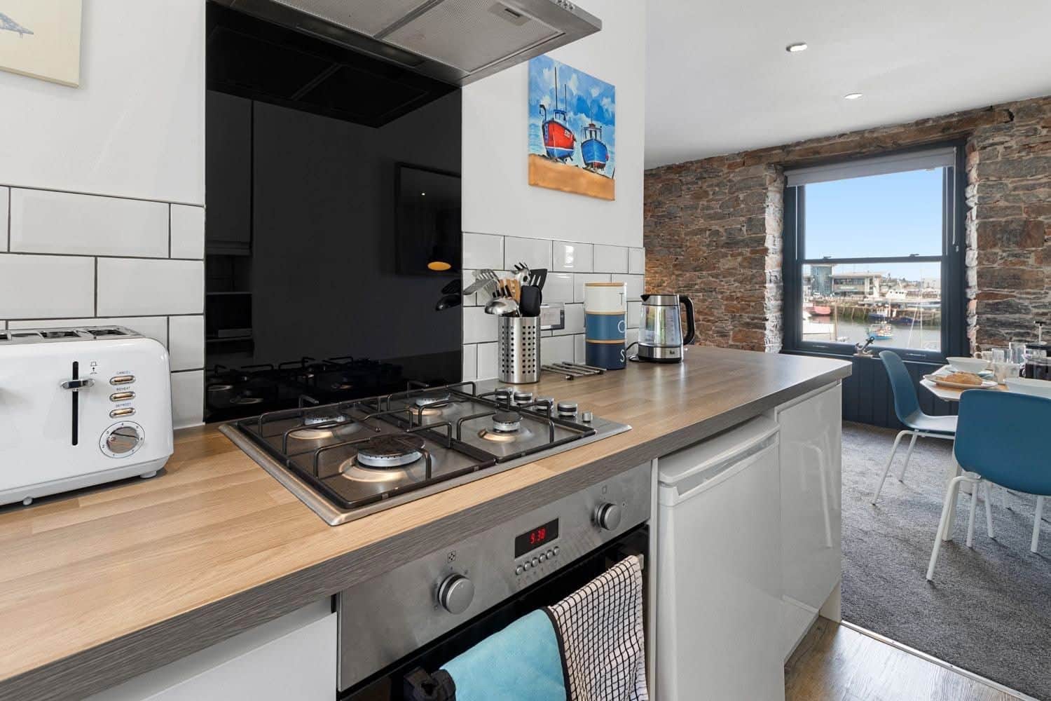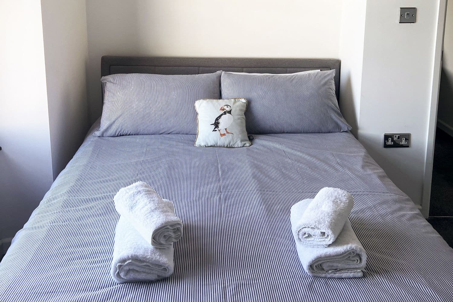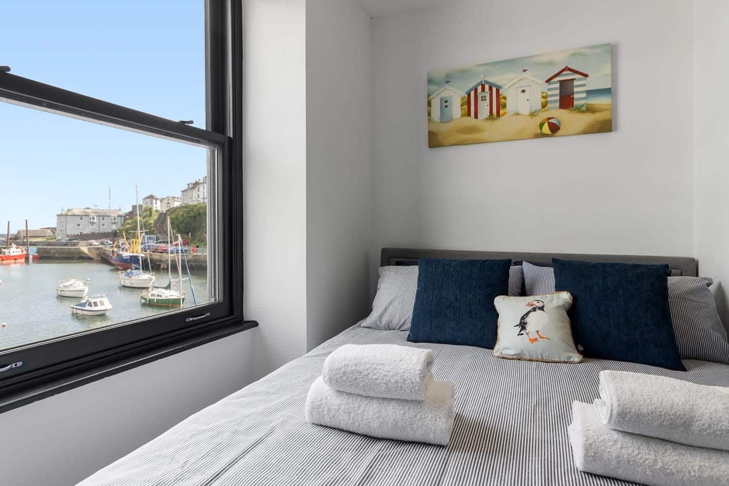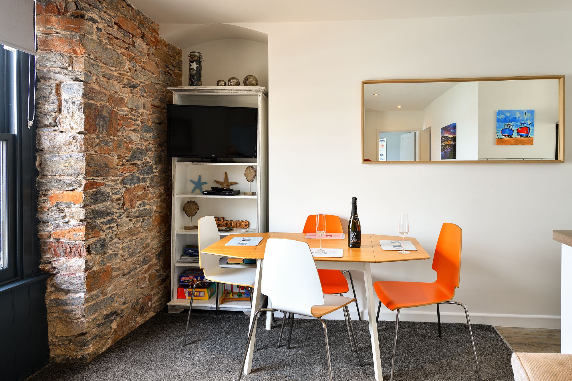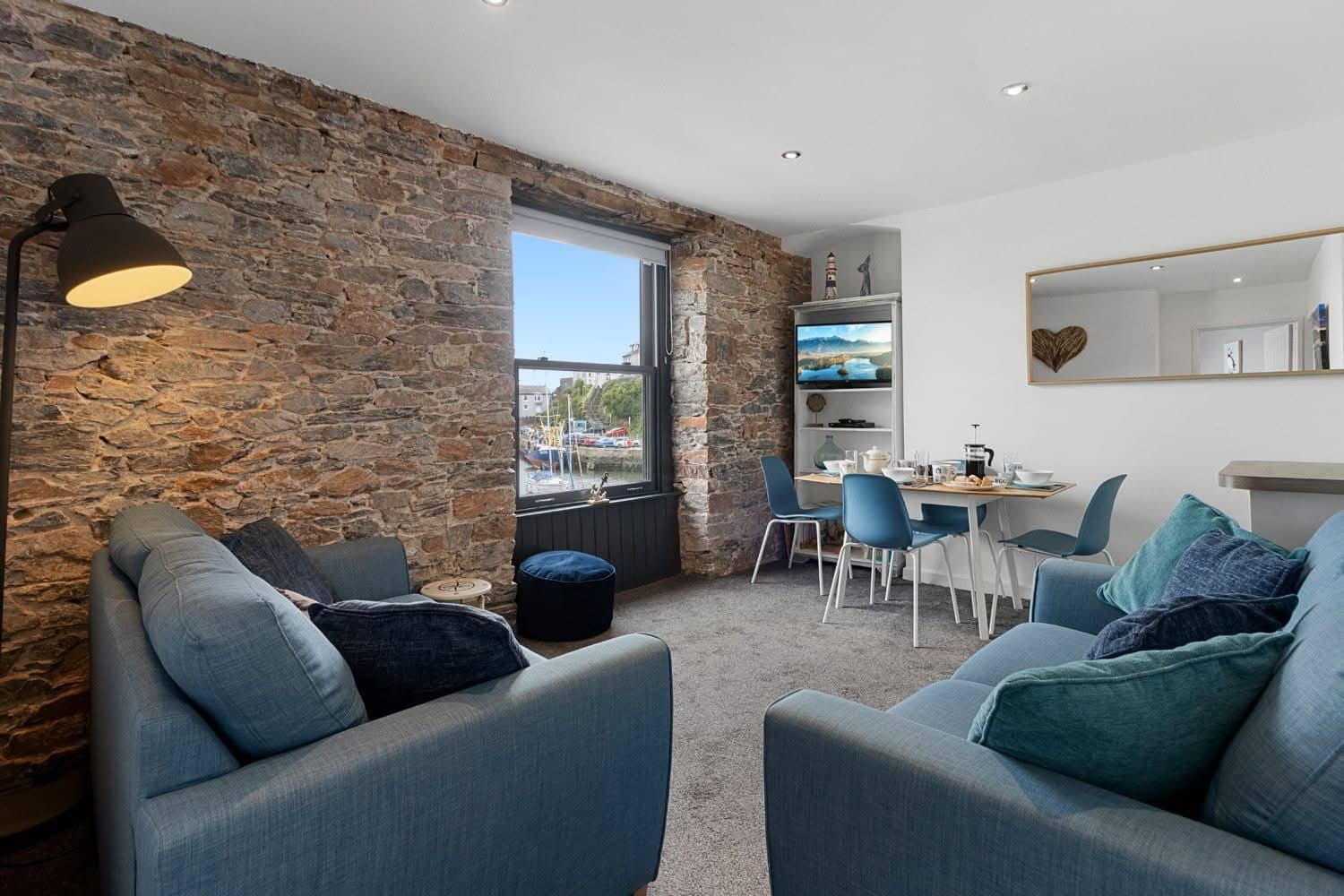 Situated right on the harbourside in Brixham are the beautiful Kings Quay sister apartments. Apartment 1 is the lower of the two and sleeps four people. It has a warm and cosy homely feel, while its exposed brick wall — framing an excellent view of the inner harbour; any closer and you’d be getting wet! — oozes character. The two apartments offer an opportunity for larger groups to enjoy closeness and convenience without sacrificing privacy.
