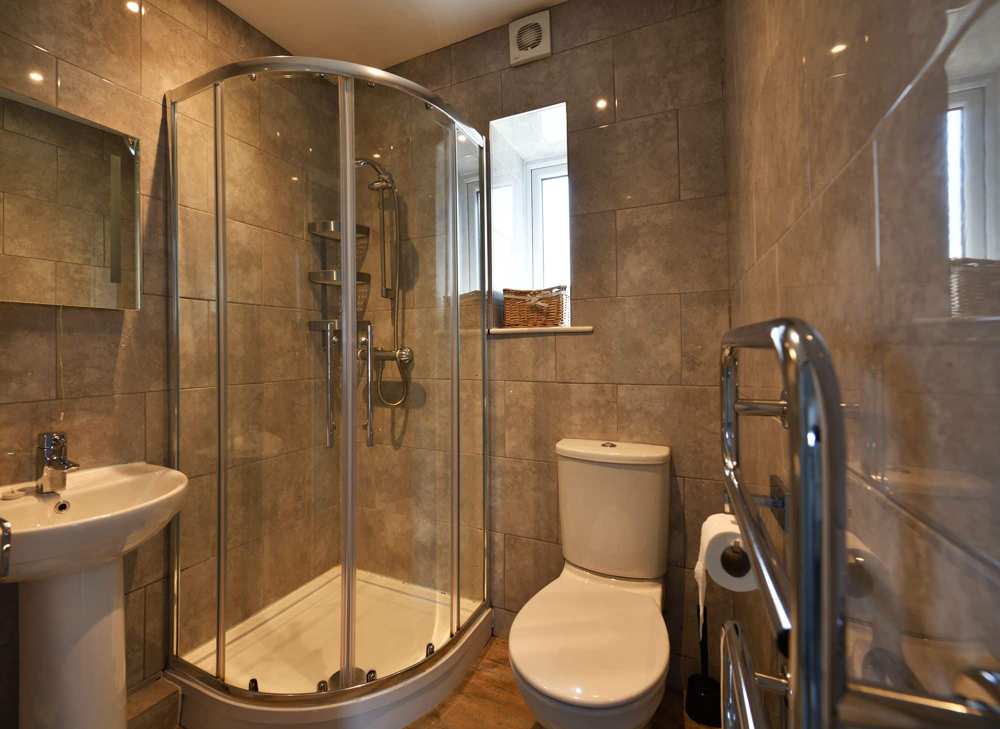 The apartment’s bathroom is fully tiled with a shower, sink, and W/C.