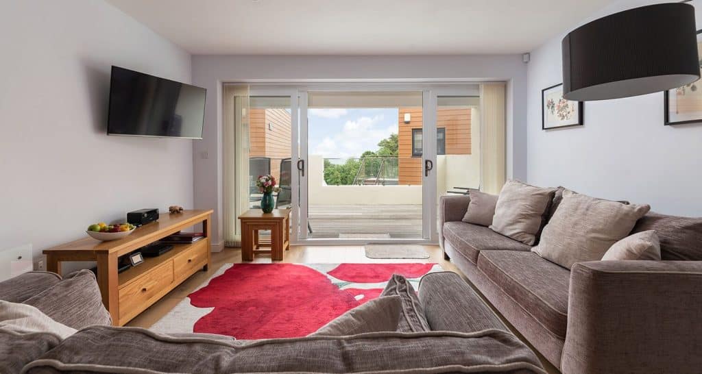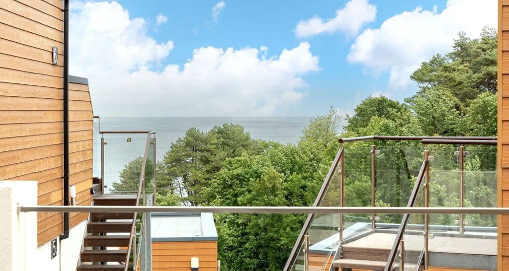 Large Glass-Front Terrace: Enjoy views of Fishcombe Cove and nearby woodlands from your private terrace, accessible from both the lounge and the master bedroom.