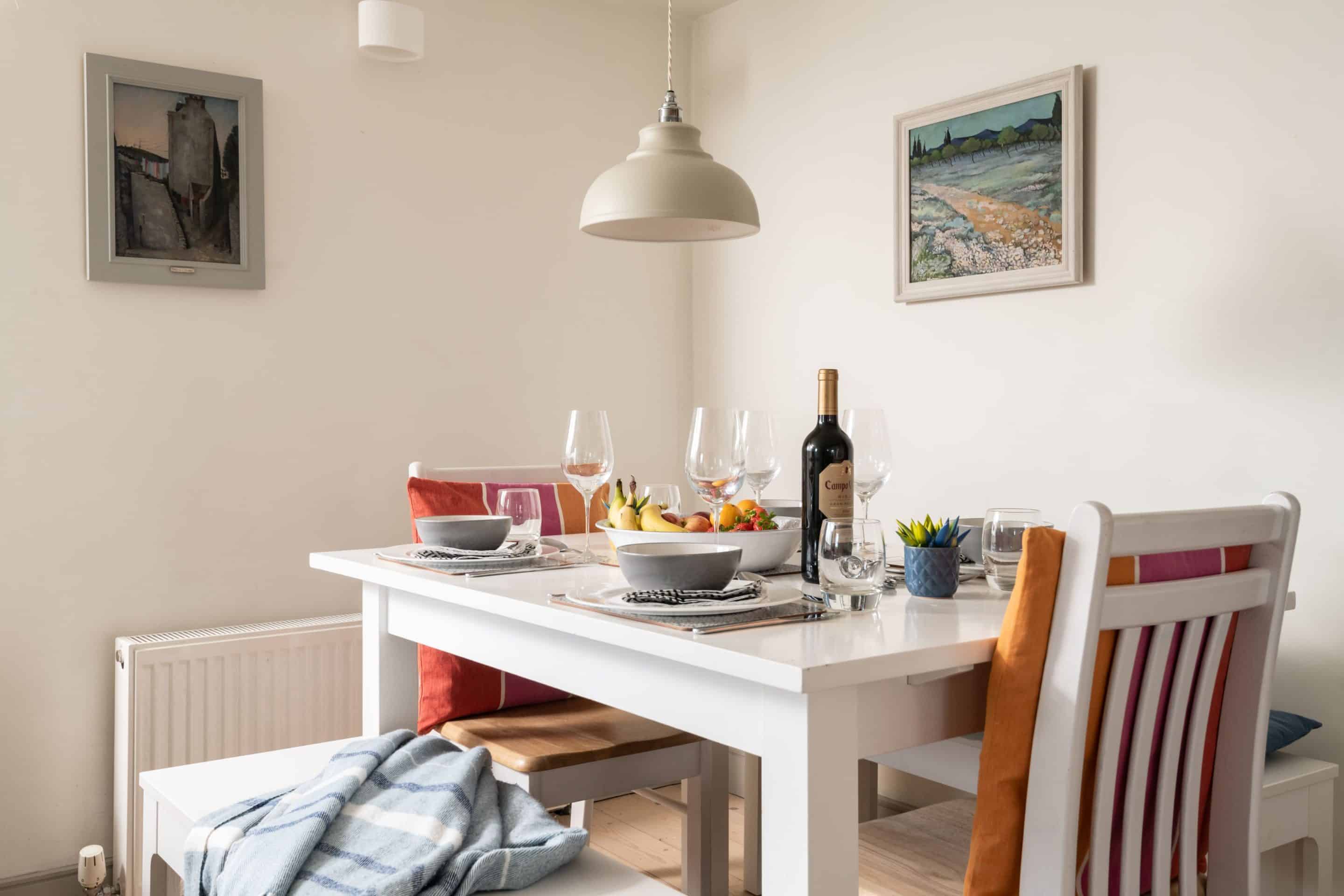 Spacious Living Area: The open-plan lounge and dining area features comfy sofas, original artwork, and mood lighting for a relaxing and inviting atmosphere.