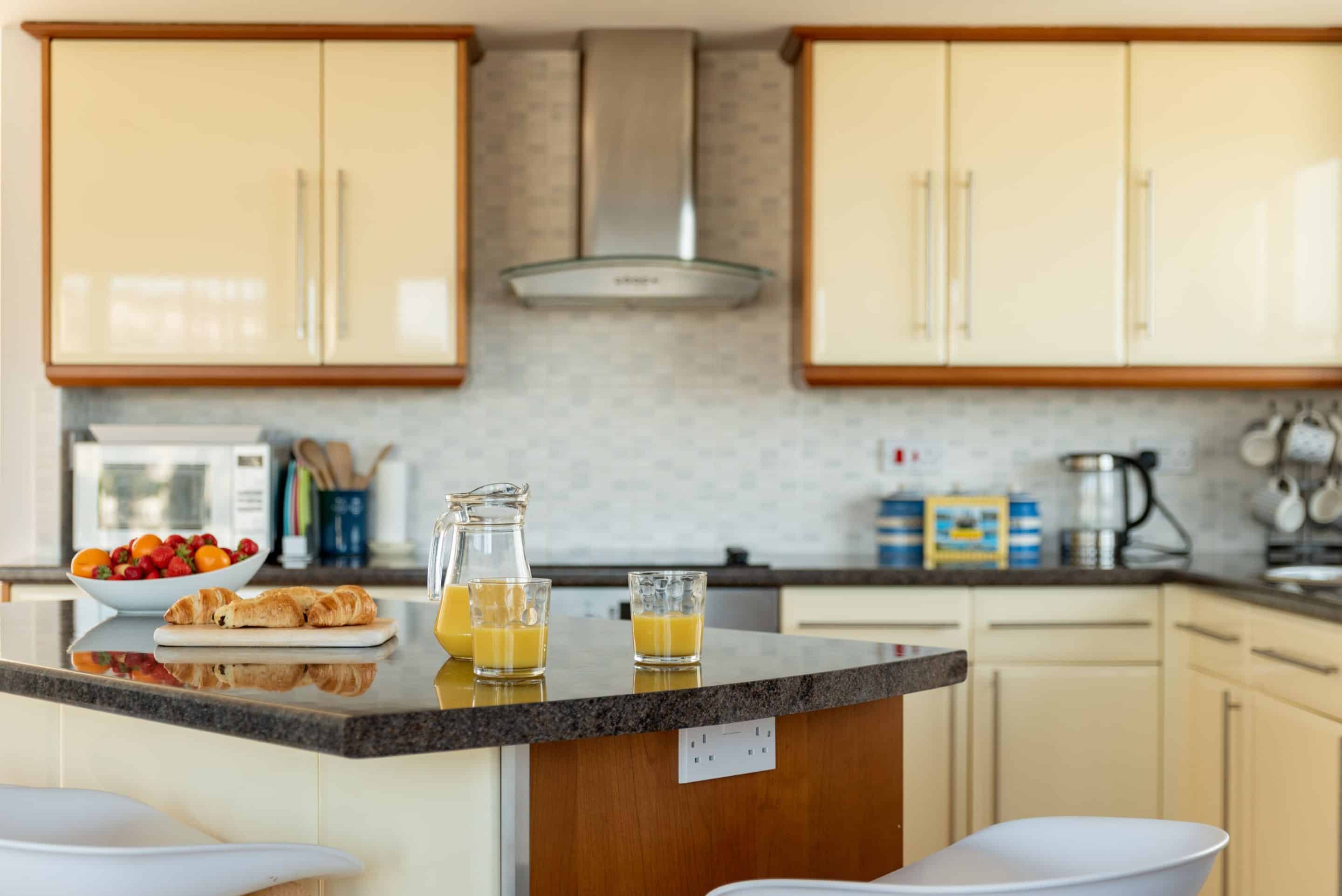 Well-Equipped Living Space: The open-plan lounge, kitchen, and dining area feature sleek, modern appliances including a dishwasher, washing machine, and microwave. The breakfast island adds to the ease of living in this holiday home.